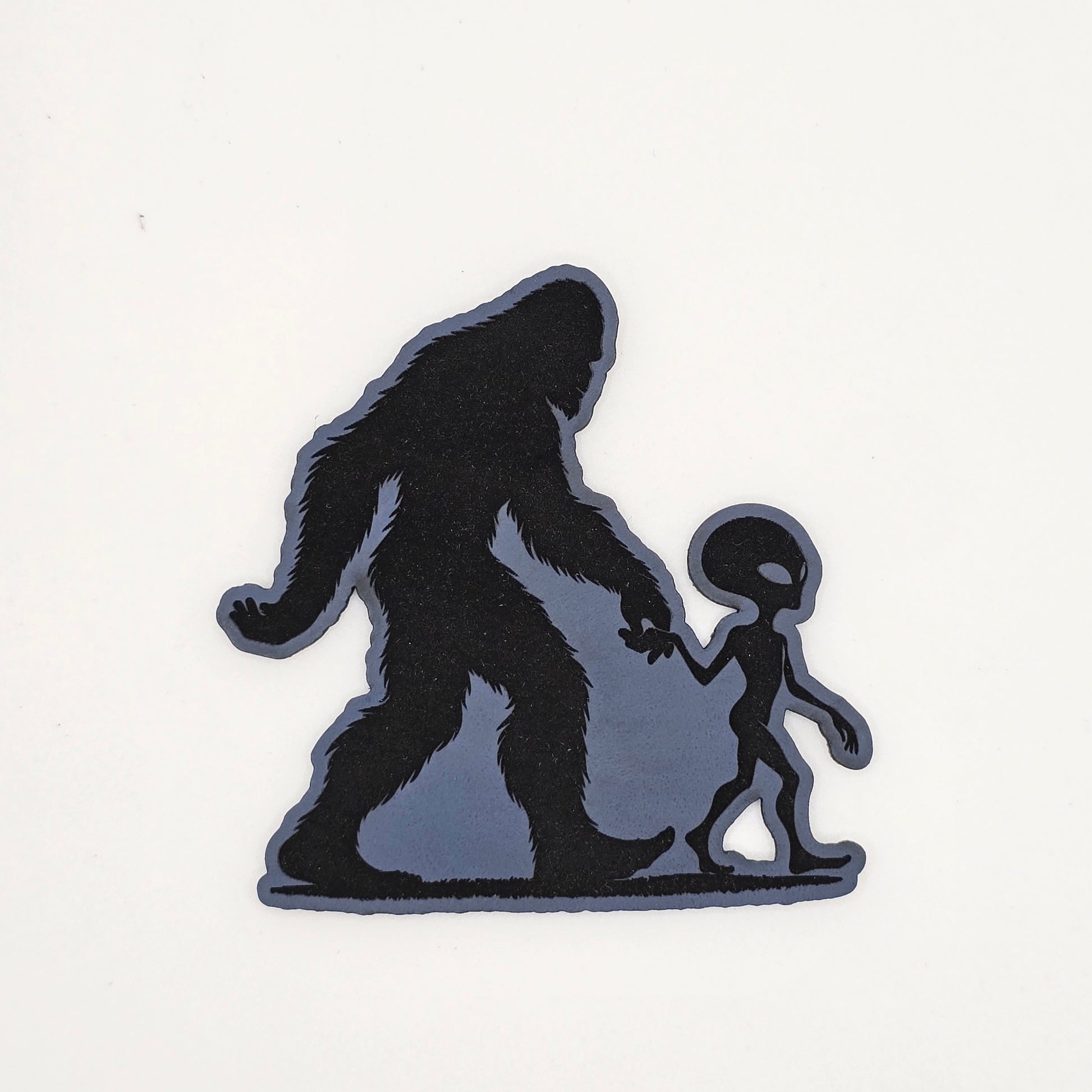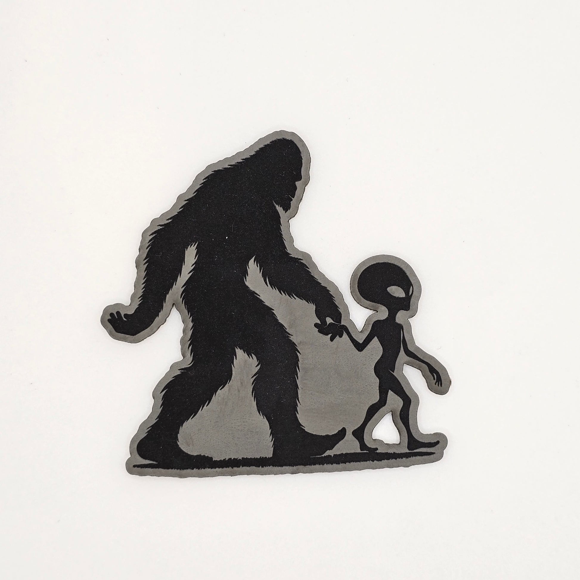 This leather patch features Sasquatch and his little alien buddy out for a peaceful stroll — hand in hand.