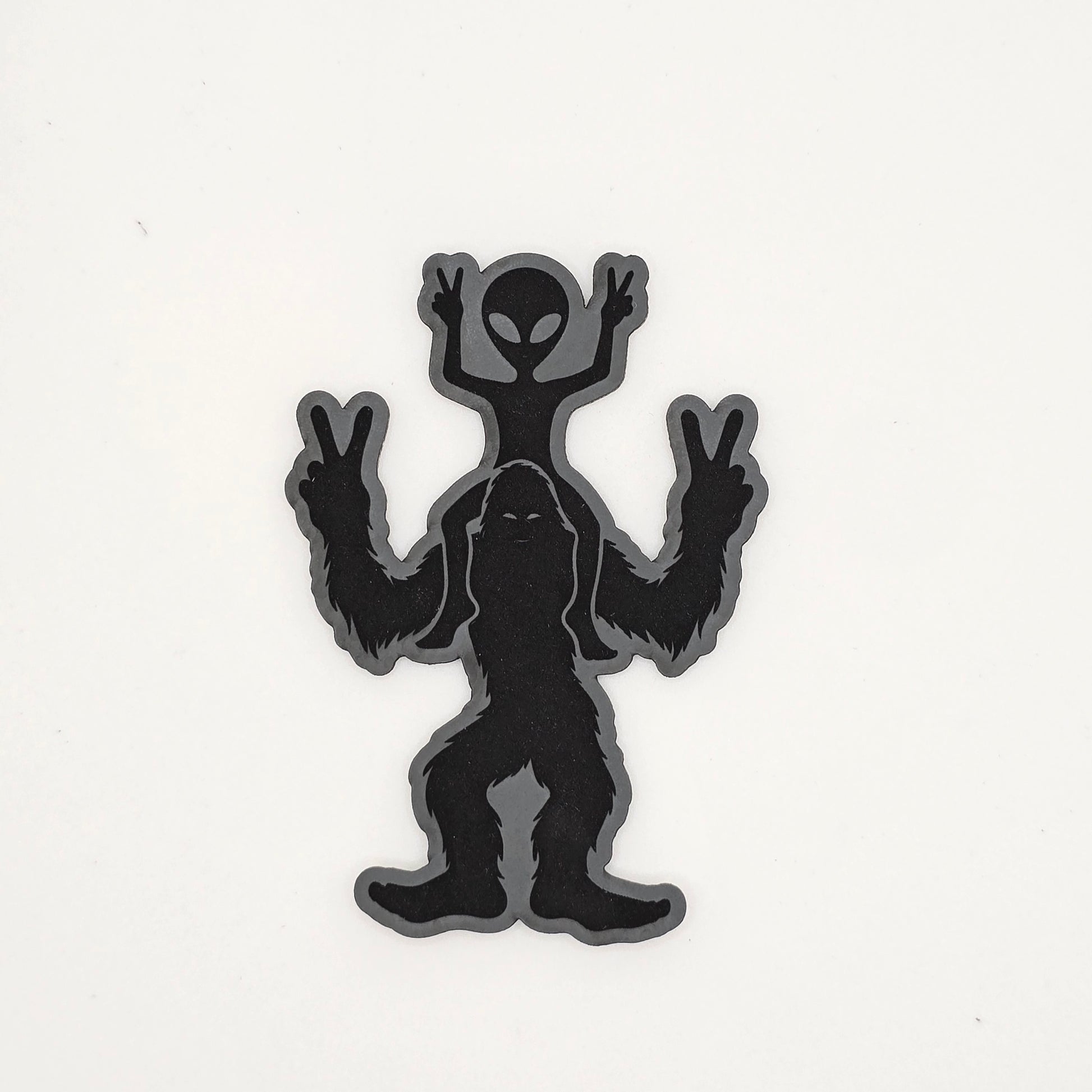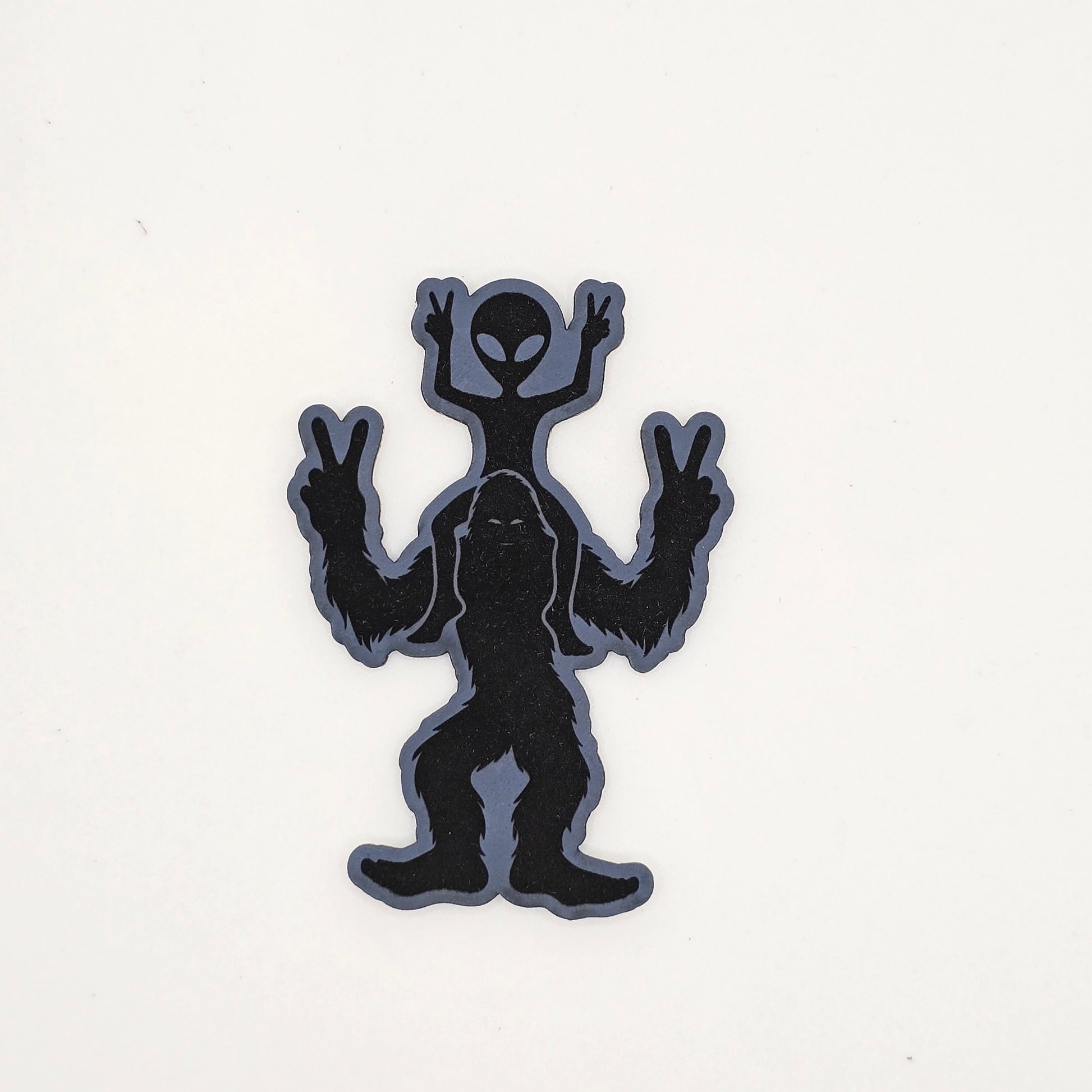 This leather patch features Sasquatch giving his extraterrestrial buddy a piggyback ride — the ultimate team-up in cryptid comedy. Whether you're a believer in UFOs, Bigfoot, or just love a good weird hat, this one's for you.