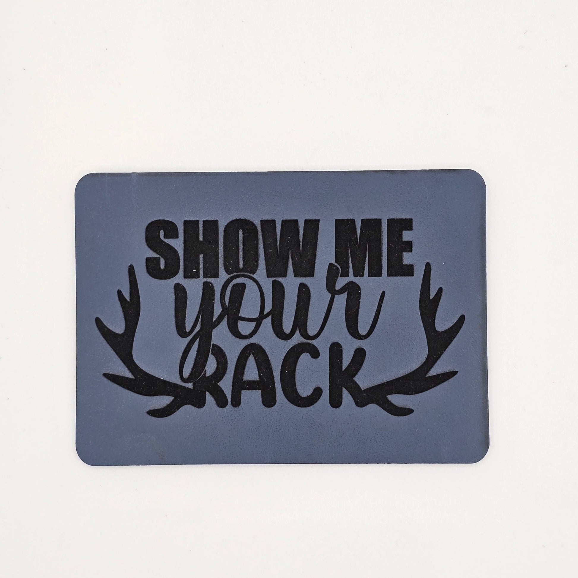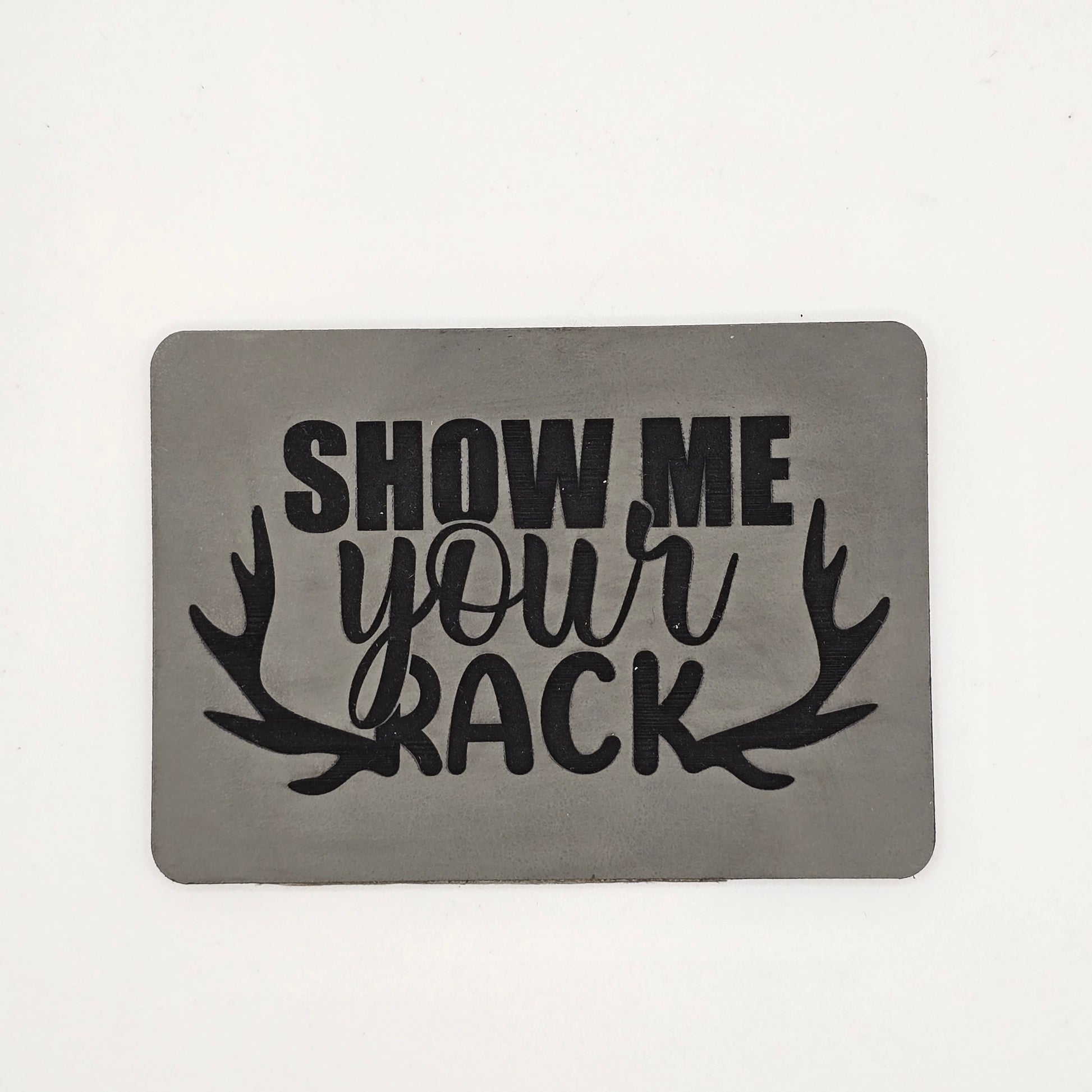 This custom leather patch hat features the phrase “Show Me Your Rack” paired with a bold set of antlers — the perfect blend of hunting humor and rustic style.