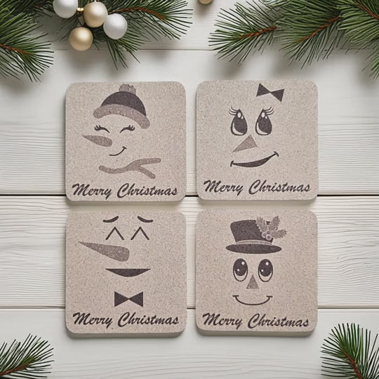 This four-piece cork coaster set features laser-engraved snowmen designs on 4" square surfaces. Made from natural cork, each coaster delivers reliable moisture absorption to safeguard furniture from condensation and spills. The precision laser engraving produces intricate, long-lasting imagery resistant to fading and wear. Ideal for holiday gatherings or winter-themed décor, these coasters blend practical protection with seasonal charm and make an excellent gift for those who appreciate functional home accessories.